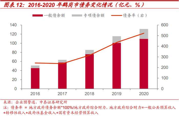 鹤岗市债务余额持续增长,偿债压力较大。根据2016-2020年的公开数据,鹤岗市债务余额从51.1亿元增加至131.3亿元,主要原因为一般债余额增长较快,债务余额年增长率维持在10%以上。2018年,当地债务率已超300%的警戒线,之后债务率持续攀升,至2020年达到522.3%。