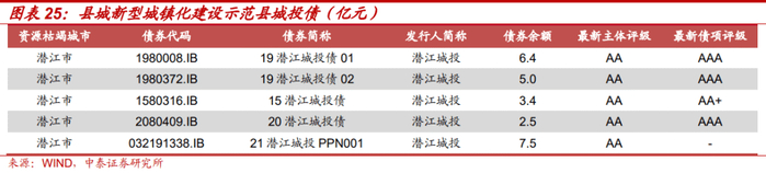 根据“十四五”规划和2035年远景目标,县城城镇化成为目前工作的重点内容,发改委831号文确认了《县城新型城镇化建设示范名单》[1],包括孝义市、新泰市和潜江市三座资源枯竭型城市。我们认为,这三座资源枯竭型城市预计会持续受到较大力度的政府支持,区域风险较为可控,区域内城投平台具有更强的信用保障,其中潜江市目前尚有存量城投债,可以适度下沉。