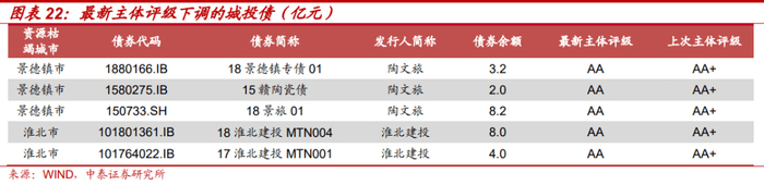 我们筛选了资源枯竭型城市城投债中最新主体评级下调的个券,共有2个主体发行的5只城投债,评级从AA+调整为AA,涉及的资源枯竭型城市为景德镇市、淮北市,建议投资者关注主体后续的经营与偿付情况。