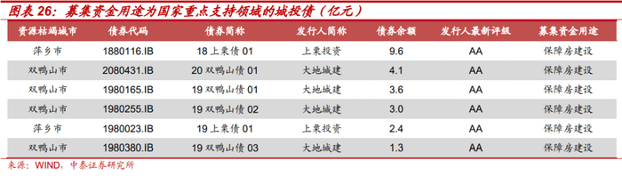 2021年12月,中共中央政治局会议[2]与中央经济工作会议[3]提出“推进保障性住房建设”,保障房建设的重要性提升至新的历史高度。因此我们认为募集资金用于保障房建设的城投主体有望获得更大力度的政府支持,国家财政和金融政策重点支持一定程度可以对冲当地经济下行及财政收入下滑带来的信用风险和估值风险,我们筛选出资源枯竭型城市城投债募集资金用途为保障房建设的债券,投资者可适当关注。