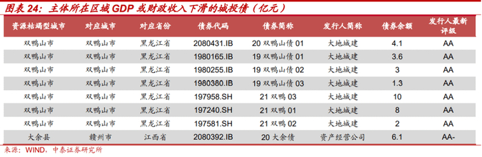 城投债的信用资质在很大程度上受当地经济结构和发展水平的影响。我们筛选了城投债发行主体所在地区2021年GDP或财政收入下滑的存量城投债,共有2个主体发行的8只城投债,涉及的资源枯竭型城市为双鸭山市、大余县,建议投资者关注地区经济下行、财政收入下滑可能带来的城投债信用风险。
