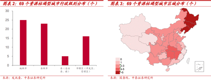 其次,我们对69座资源枯竭型城市(县、区)名录的确认历程进行了梳理,发改委分别于2008、2009、2011年确认了12个、25个和32个资源枯竭型城市。此外,我们还考察了69座资源枯竭型城市的行政级别分布和区域分布情况。