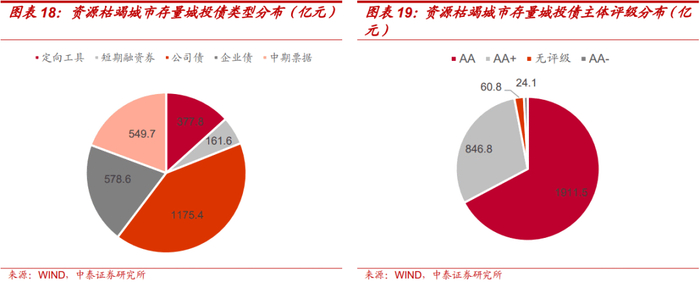 此外,我们分析了资源枯竭型城市存量城投债概况,截至2022年3月26日,存量城投债中有474只个券来自21座资源枯竭型城市,存量债券余额2843.1亿元。从债券类型、主体评级、发行期限以及剩余期限四个维度进行了统计性分析。