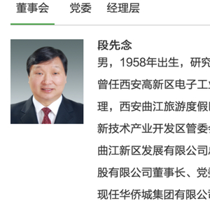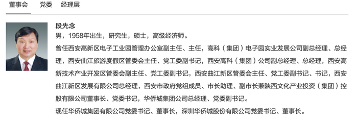 资料显示,段先念1958年出生,研究生,硕士,高级经济师。自2014年初加入华侨城集团,曾任西安高新区电子工业园管理办公室副主任、主任,西安曲江新区发展有限公司总经理,西安市政府党组成员、市长助理、副市长兼陕西文化产业投资(集团)控股有限公司董事长、党委书记,华侨城集团公司总经理、党委副书记。