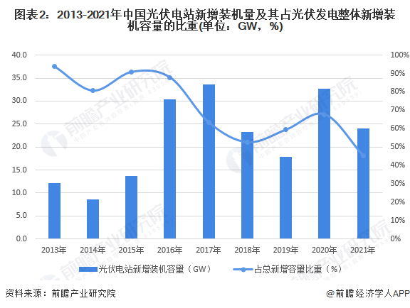 从近年来全国光伏电站新增装机量来看,2013-2021年,全国光伏电站新增装机容量波动变化较大,2021年全国光伏电站发电新增装机量为24GW,同比下降27%;从光伏电站新增装机容量占光伏发电整体新增装机容量的比重来看,从2013年的94%波动下降至2021年的45%左右,全国光伏电站装机容量的下滑也进一步影响到集中式光伏逆变器市场的发展。