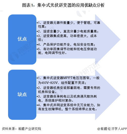 集中式光伏逆变器是光伏逆变器中的一种,它是将光伏组件产生的直流电汇总转变为交流电后进行升压、并网。国内常见的集中式光伏逆变器系统方案为:光伏组件→直流电缆→直流汇流箱→直流电缆→集中式逆变器→交流电缆→升压变压器。其核心是将汇总后的直流电转变为交流电,因此集中式光伏逆变器的功率都相对较大。集中式光伏逆变器的主要应用优缺点如下: