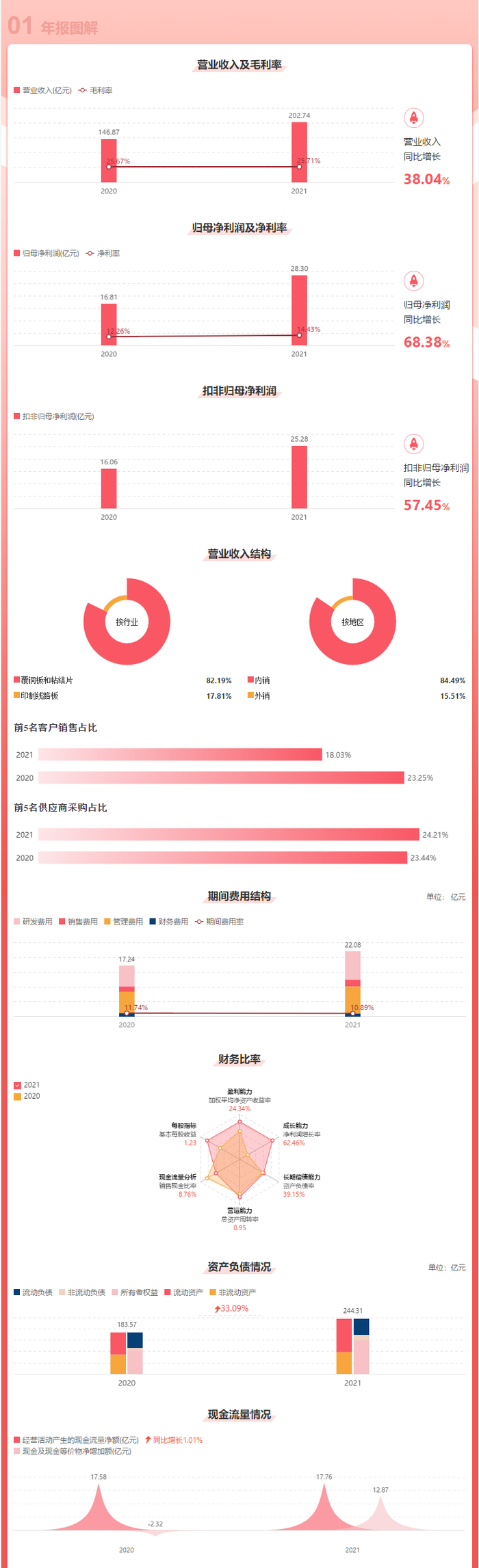生益科技于2022年03月29日发布了2021年年度报告。数据显示公司2021年度实现营业总收入202.74亿元,同比增长38.04%;实现归属于上市公司股东净利润28.30亿元,同比增长68.38%;加权平均净资产收益率24.34%,同比增长6.06个百分点;基本每股收益为1.23元,同比增长66.22%。