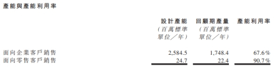产能与产能利用率方面,面向企业客户销售的设计产能为2,584.5百万标准单位/年,产能利用率67.6%;面向零售客户销售设计产能为24.7百万标准单位/年,产能利用率90.7%。
