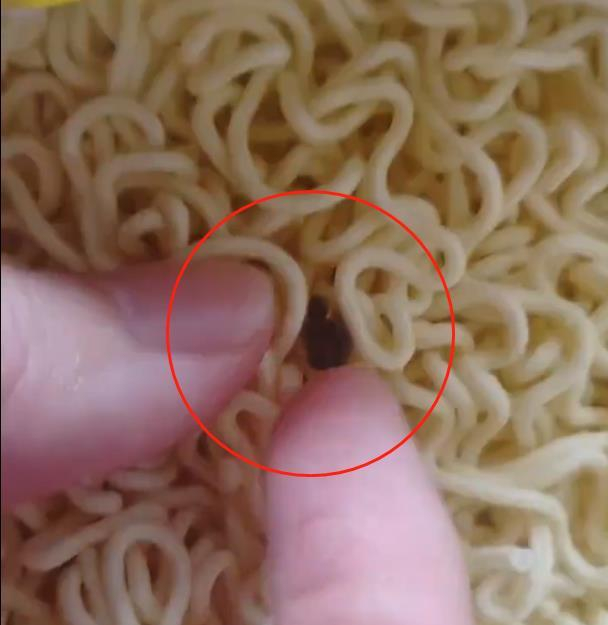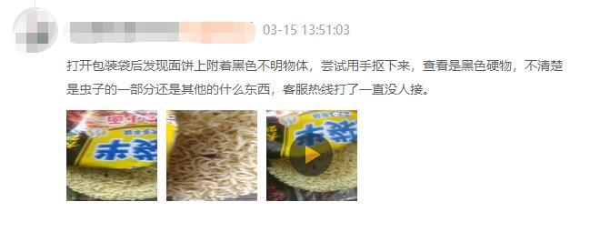 在3月15日发起的一起投诉中,消费者称在今麦郎一袋半重庆小面面饼上有不明物体,“打开包装袋后发现面饼上附着黑色不明物体,尝试用手抠下来,查看是黑色硬物,不清楚是虫子的一部分还是其他的什么东西,客服热线打了一直没人接。”消费者上传的视频显示,在方便面饼上嵌有一块黑色的硬物,消费者尝试用手将其抠下来,但仍有部分黑色物体牢固附着在面饼上。该起投诉同样是“已完成”状态。