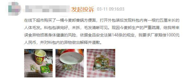 在3月11日发起的一起投诉中,消费者表示,在今麦郎香锅地道辣面中发现人体毛发样异物,“在线下超市购买了一桶今麦郎香锅方便面,打开外包装后发现料包内有一根约五厘米长的人体毛发。料包包装完好、未拆,毛发清晰可见。”消费者认为这是今麦郎生产的严重疏漏,担心误食异物会损害身体健康,要求今麦郎厂家赔偿其1000元并就异物问题作出解释。该起投诉目前显示状态为“已完成”(今麦郎跟进处理且消费者接受了处理结果)。