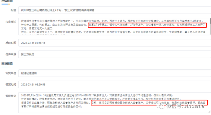 而对于祥生江山云樾西府的业主,目前也刚得到杭州钱塘住建的回复,3月21日,钱塘区住建局称:“我局高度关注,对该项目进行了约谈,截至目前已有几十个人进场施工,在做复工准备工作,按计划月底恢复正常建设状态。根据目前的监管办法,预售房款进入监管帐户才能网签通过。