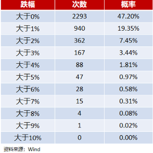 下图统计了沪深300指数近20年单日跌幅超过一定比例的次数和概率: