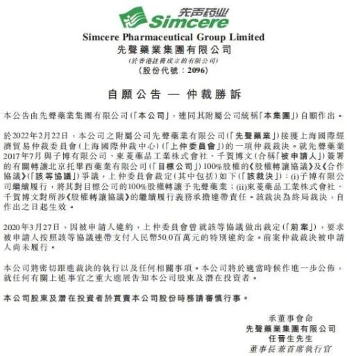 近期,在港上市的先声药业(02096.HK)披露先声药业在收购北京托毕西药业有限公司(简称“托毕西药业”)100%股权的纠纷中仲裁胜诉,托毕西药业100%股权必须转让予先声药业。