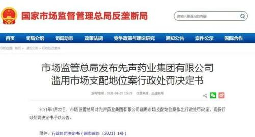 由于先声药业的行为违反了《反垄断法》,2021年1月22日被市场监管总局处以1.007亿的罚款。2021年1月29日,先声药业公告称,基于处罚的金额,公司认为有关事件及行政处罚不会对本公司的业务经营及财务状况产生任何重大影响。