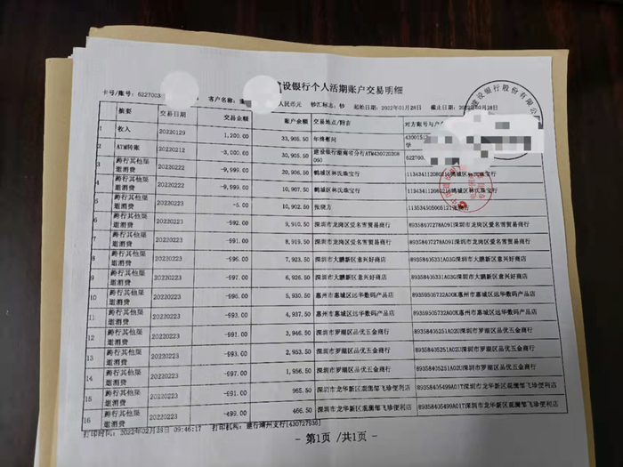 董先生1月28日打印的明细显示,其银行卡于1月22日至23日在怀化、深圳等地被盗刷多次。 本文图片均由受访者提供