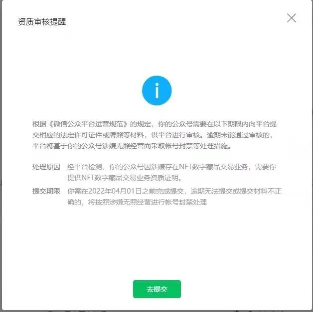 此外,本报记者了解到,除了被关停的数字藏品公众号,多个数字藏品相关公众号收到微信通知的“资质审核提醒”。根据资质审核提醒中提到的处理原因为,经平台检测,你的公众号因涉嫌存在NFT数字藏品交易业务,需要你提供NFT数字藏品交易业务资质证明。并需要在2022年4月1日前提交完成,近期无法提交或提交材料不正确的,将按照涉嫌无照经营进行账号封禁处理。