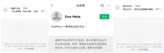 其中One meta方面向本报记者表示:“具体原因暂时还不清楚,不会影响新的公众号正常使用。”其新公众号此前已改名为“幻藏艺术平台”。
