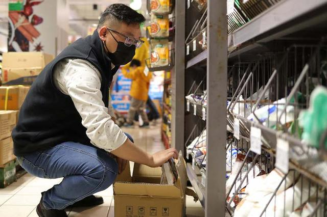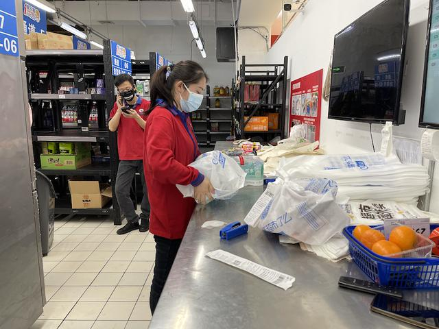 第一财经记者在现场看到,季林枫手边的绿叶菜货柜在1~2小时内已经见底,在他的安排下,一批新鲜的蔬菜通过推车拉到了店长和一些店员的手边,然后大家开始拆包装,补货。“这几天我们全员都上阵,大家都是理货员,即便你是办公室的行政、管理人员、公关部人员等统统扑到一线干活。”季林枫和几位店员仅2分钟不到就补完了一轮蔬菜,这样的高效率补货,在近期每天要进行十几次,差不多是平日里的至少4~5倍,按照7点半开门到晚上延长到10点关门,部分生鲜热销货品几乎是每小时都在补货。