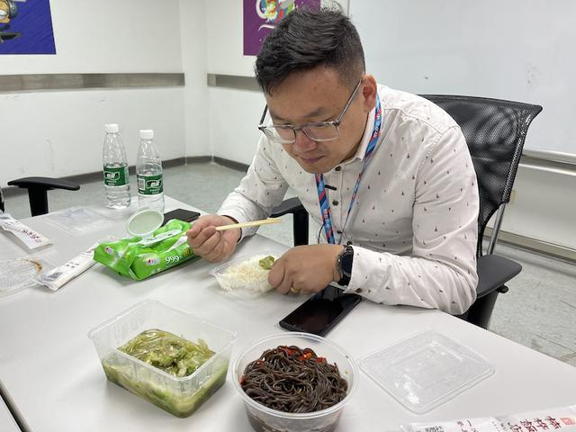 中午12点半左右,季林枫终于可以喘一口气吃午饭了。但“这口气”也仅仅15分钟。“抗疫保供以来,我们店内的工作人员吃饭时间都在15分钟左右,迅速吃完饭,赶紧工作。因为一定要保证店内有基础人手。”一边吃饭,季林枫一边还在电话安排工作,包括下午的补货、供应商沟通、住店员工睡袋的购买等。虽然店内备了3~4倍的蔬果,但店长的午餐仅一个绿叶菜,非常简单。“其实我忙起来根本吃不下饭,我早饭也没有吃,有时候一天也就吃这一顿,工作太紧张了。”