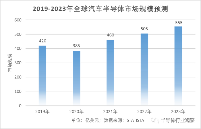 据Statista数据显示,2021年全球汽车半导体市场规模约460亿美元,预计2023年将超过约555亿美元的规模。