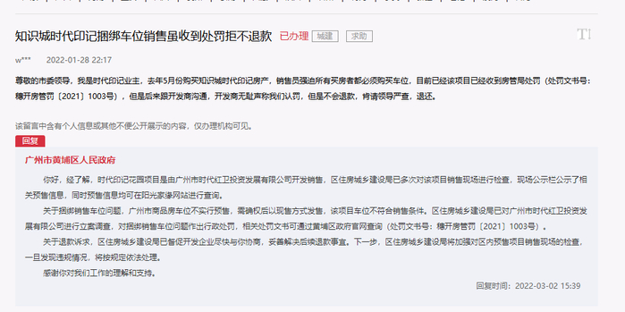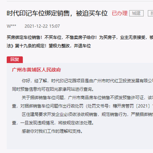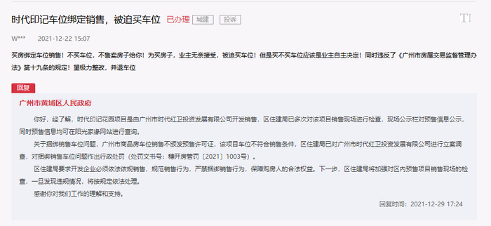 随后,广州市黄浦区人民政府回复称,区住建局已多次对该项目销售现场进行检查,现场公示栏对预售信息公示,同时预售信息均可在阳光家缘网站进行查询。表明了关于捆绑销售车位问题,称广州市商品房车位销售不颁发预售许可证,该项目车位不符合销售条件,当地住建局已对广州市时代红卫投资发展有限公司进行立案调查。