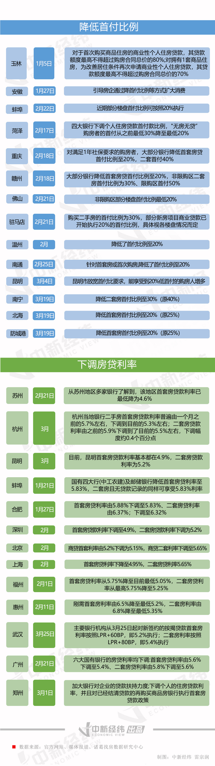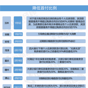 中新经纬还注意到,一些城市的首付比例也出现下调。3月19日,广西壮族自治区市场利率定价自律机制召开会议,商定下调部分城市房贷首付比例:在南宁市区已拥有一套住房的,再次购买普通商品住房的商贷最低首付比例由40%调整为30%,北海、防城港首次购买普通商品住房的商贷最低首付款比例由25%调整为20%。