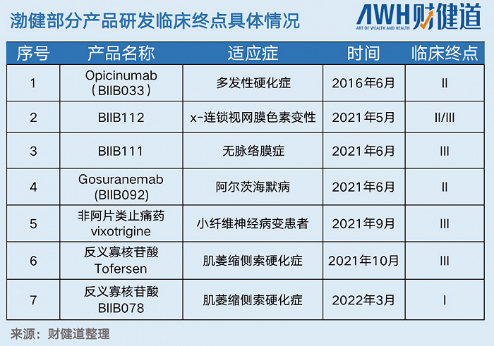 2021年8月,多发性硬化症药物opicinumab研发止步于II期临床试验,因为该药在II期AFFINITY研究中未到达主要和次要终点。2022年1月,渤健从Ionis Pharmaceuticals引进一种治疗SMA的药物——BIIB115/ION306的全球独家许可,然而距离上市任重道远。