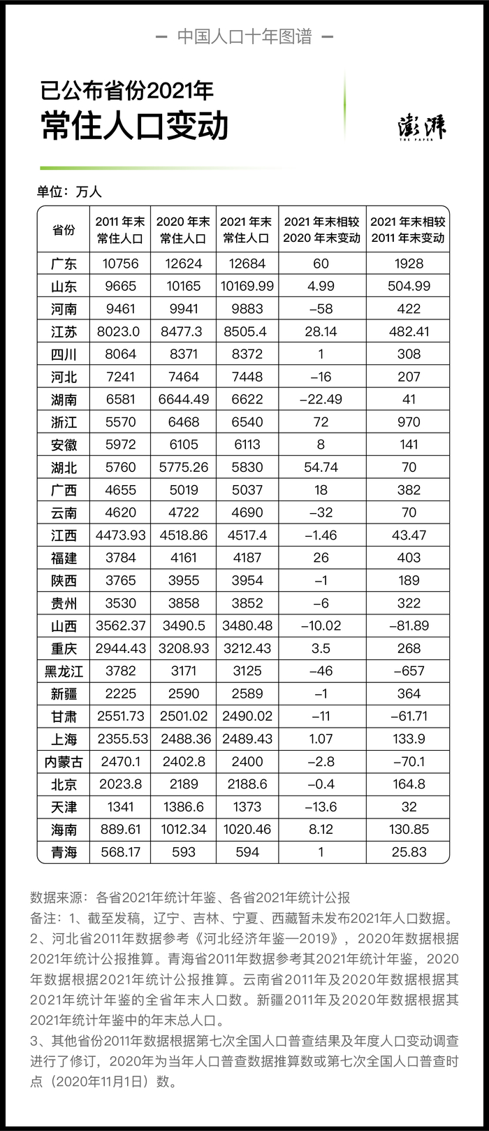 已公布省份2021年末常住人口相对2020年末及2011年末的变动 制图  澎湃新闻 晁嘉笙、彭艳秋