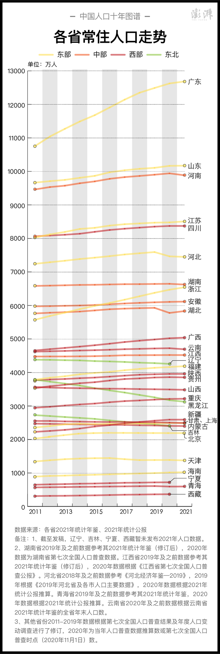 31省区市2011年末以来的常住人口走势  制图  澎湃新闻 晁嘉笙、彭艳秋
