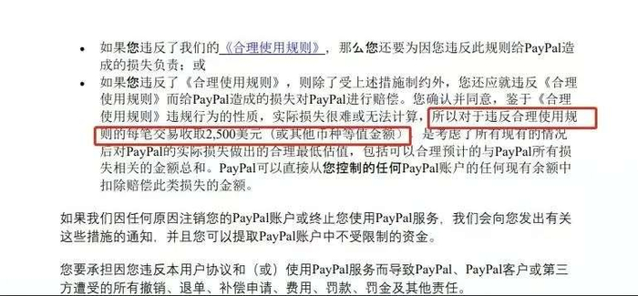 对PayPal进行赔偿。如果违反造成的损失,就得按照次数(交易笔数),每笔交易收取2,500美元的违约金。PayPal可以直接从控制的任何PayPal账户的任何现有余额中,扣除赔偿此类损失的金额。