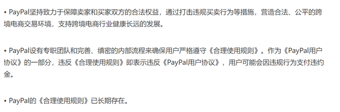 针对于此问题,PayPal官方回应称,“致力于保障卖家与卖家的合法权益”、“违反《合理使用规则》,用户可能会因违规行为支付违约金”。