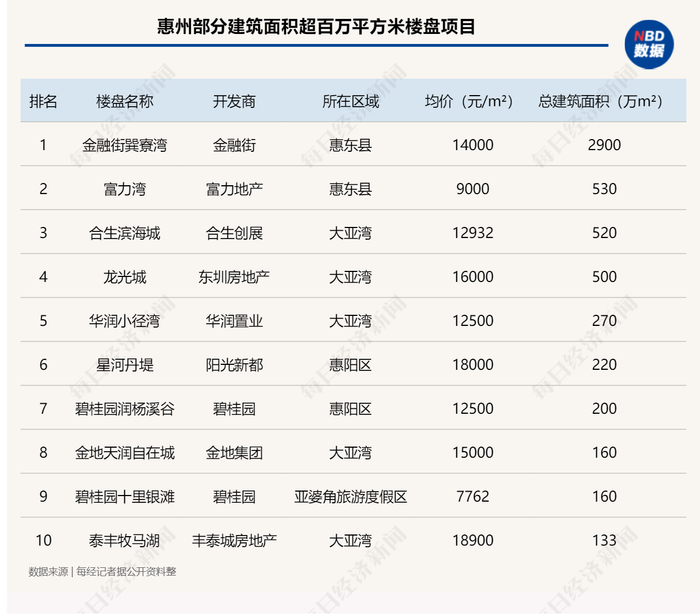 据《每日经济新闻》记者不完全统计,惠州建筑面积超百万平方米的楼盘项目就达10余个。