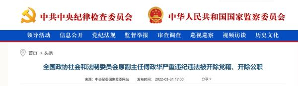 3月31日下午,中纪委网站发布通报,全国政协社会和法制委员会原副主任傅政华严重违纪违法被开除党籍、开除公职。