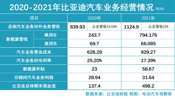2021年比亚迪在销售贡献层面,成为了真正意义上的新能源汽车企业,自然也就承受了新能源车企的成本之痛。