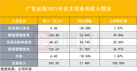 2021年广发证券实现营业收入342.50亿元,同比增长17.48%,归属于上市公司股东的净利润为108.54亿元,同比增长8.13%,全行业排名暂列第六。业绩基本盘扎实稳健之下,除投行与其他业务,公司多项业务均衡发力,均实现两位数营收增幅。