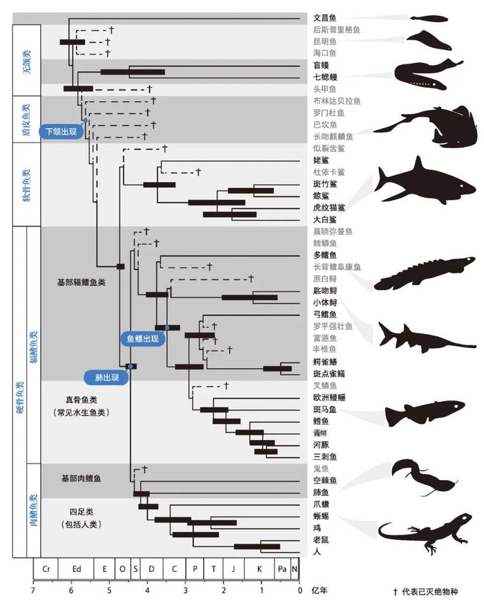 脊椎动物演化的系统发育图 Cr,成冰纪;Ed,埃迪卡拉纪;E,寒武纪;O,奥陶纪;S,志留纪;D,泥盆纪;C,石炭纪;P,二叠纪;T,三叠纪;J,侏罗纪;K,白垩纪;Pa,古近纪;N,新近纪。