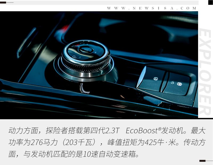 动力方面,探险者搭载第四代2.3T EcoBoost®发动机。最大功率为276马力(203千瓦),峰值扭矩为425牛·米。传动方面,与发动机匹配的是10速自动变速箱。基于CD6纵置后驱平台,探险者拥有50:50黄金前后轴平衡配重以及超敏轻量化铝合金前/后悬架。