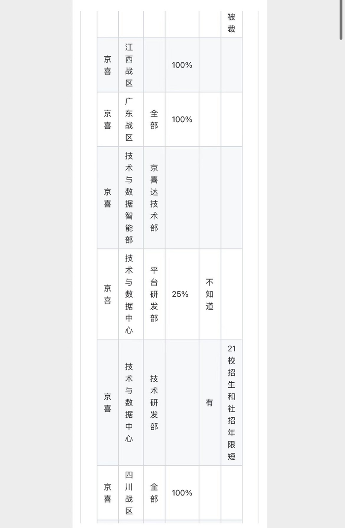 京喜也是裁员较多的业务。一位京东员工向第一财经提供了一份关于京喜裁员的截图。截图显示,京喜广东战区、四川战区和江西战区裁员比例为100%。此外,京喜平台研发部裁员25%,技术研发部也有部分裁员。