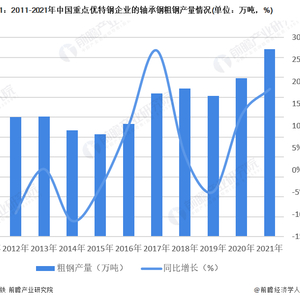 轴承钢是制造各类滚动轴承套圈和滚动体的合金钢总称,具有高硬度、耐磨性和高弹性,是生产要求最严格的特钢之一。近年来,随着我国经济的发展和工业的进步,轴承钢产业也得以快速发展,中国已经成为全球最大的轴承钢生产国。自2015年开始,在“工业制造2025”政策的推动下,高端轴承钢生产技术得到快速突破和提升,产量规模也呈现波动上涨态势。2021年,全国重点优特钢企业的轴承钢粗钢产量突破470万吨,同比增长18%,创历史新高。