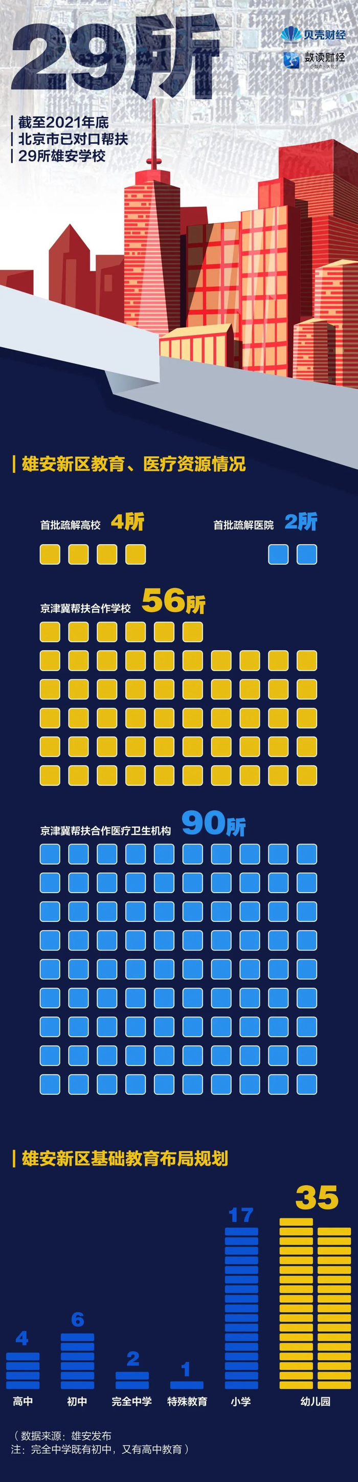 为充分发挥北京优质教育、医疗卫生等资源的辐射带动作用,助力河北雄安新区提升公共服务水平,北京市以“交钥匙”方式全额投资建设幼儿园、小学、完全中学、综合医院各1所,建成后移交雄安新区,分别由北海幼儿园、史家小学、北京四中、宣武医院提供办学办医支持。