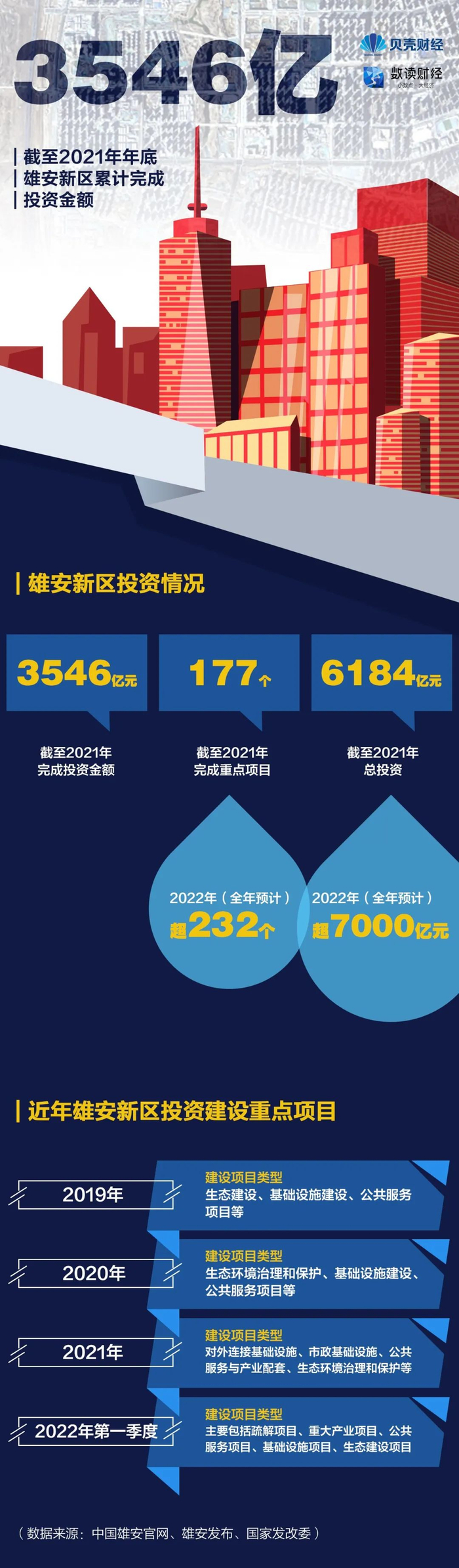 近年来,雄安新区建设投资领域也不断扩大。新京报贝壳财经记者梳理发现,2022年其总投资将超7000亿元,年度计划投资3000多亿元。其中,不仅有央企疏通项目还有体育中心、大学园图书馆等重大公共服务项目。这表示雄安新区已经开始更多公共服务的功能性布局建设。