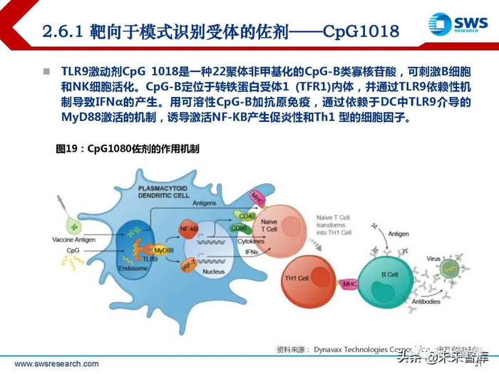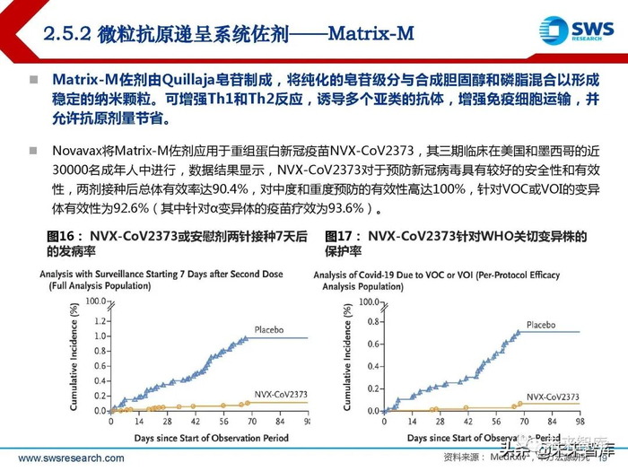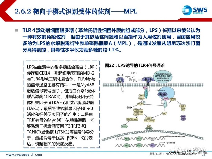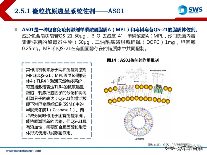 其作用机制来源于两种免疫刺激剂 MPL和QS-21:MPL通过Toll样受 体4(TLR4)激活天然免疫系统, 可直接激活表达TLR4的抗原递呈 细胞,刺激细胞因子的分泌和协同 刺激分子的表达;QS-21能激活被 膜下淋巴窦巨噬细胞(SSMs)中的 半胱天冬酶1(Caspase 1)。两 种成分同时作用于固有免疫系统, 能协同激活新的通路。但QS-21具 有溶血性,需要配合胆固醇和脂质 体形式使用以消除副作用。