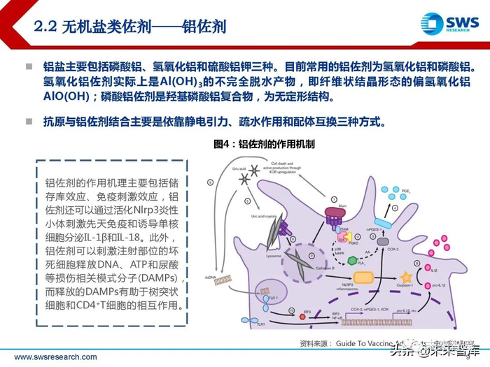 铝佐剂的作用机理主要包括储 存库效应、免疫刺激效应,铝 佐剂还可以通过活化Nlrp3炎性 小体刺激先天免疫和诱导单核 细胞分泌IL-1β和IL-18。此外, 铝佐剂可以刺激注射部位的坏 死细胞释放DNA、ATP和尿酸 等损伤相关模式分子(DAMPs), 而释放的DAMPs有助于树突状 细胞和CD4 +T细胞的相互作用。