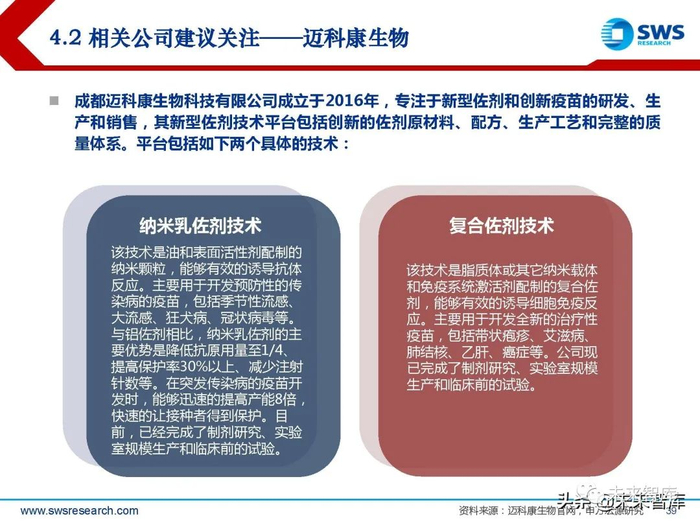 成都迈科康生物科技有限公司成立于2016年,专注于新型佐剂和创新疫苗的研发、生 产和销售,其新型佐剂技术平台包括创新的佐剂原材料、配方、生产工艺和完整的质 量体系。平台包括如下两个具体的技术: