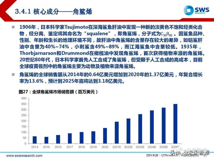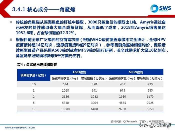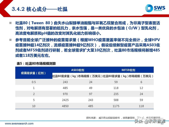 根据目前已获批的新型佐剂,相关的活性成分主要包括角鲨烯、吐温80、单磷酰脂质 A以及皂苷提取物。根据Evaluate Pharma测算,全球人用疫苗市场2015-2019年复合增长率为7.8%, 2020年市场规模约410亿美元;疫苗市场的快速扩容将带来佐剂市场及相关活性原材 料需求的快速增加。