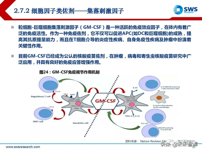 细胞因子是机体的免疫系统在受到抗原和各种免疫佐剂激活后,产生应答性的一类免疫 调节物质,具有明显的免疫佐剂效应。细胞因子可被分为白细胞介素(IL)、干扰素 (IFN-γ)、肿瘤坏死因子超家族、集落刺激因子、趋化因子、生长因子等。
