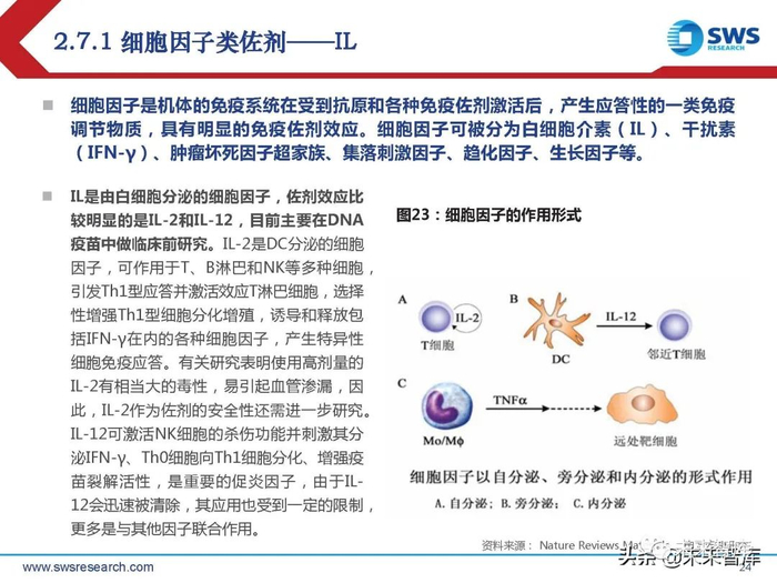 IL是由白细胞分泌的细胞因子,佐剂效应比 较明显的是IL-2和IL-12,目前主要在DNA 疫苗中做临床前研究。IL-2是DC分泌的细胞 因子,可作用于T、B淋巴和NK等多种细胞, 引发Th1型应答并激活效应T淋巴细胞,选择 性增强Th1型细胞分化增殖,诱导和释放包 括IFN-γ在内的各种细胞因子,产生特异性 细胞免疫应答。有关研究表明使用高剂量的 IL-2有相当大的毒性,易引起血管渗漏,因 此,IL-2作为佐剂的安全性还需进一步研究。IL-12可激活NK细胞的杀伤功能并刺激其分 泌IFN-γ、Th0细胞向Th1细胞分化、增强疫 苗裂解活性,是重要的促炎因子,由于IL12会迅速被清除,其应用也受到一定的限制, 更多是与其他因子联合作用。