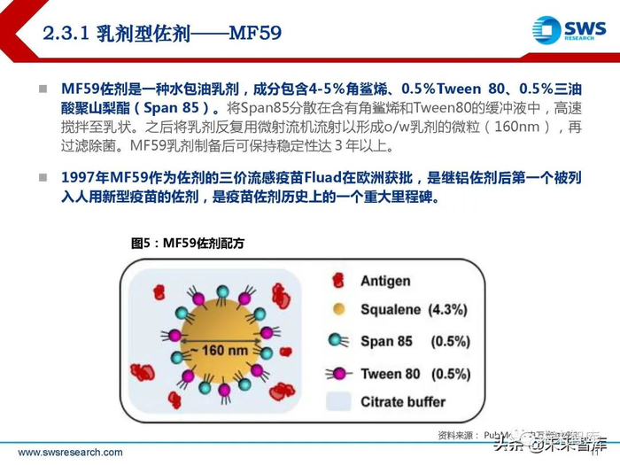 MF59佐剂是一种水包油乳剂,成分包含4-5%角鲨烯、0.5%Tween 80、0.5%三油 酸聚山梨酯(Span 85)。将Span85分散在含有角鲨烯和Tween80的缓冲液中,高速 搅拌至乳状。之后将乳剂反复用微射流机流射以形成o/w乳剂的微粒(160nm),再 过滤除菌。MF59乳剂制备后可保持稳定性达3年以上。1997年MF59作为佐剂的三价流感疫苗Fluad在欧洲获批,是继铝佐剂后第一个被列 入人用新型疫苗的佐剂,是疫苗佐剂历史上的一个重大里程碑。