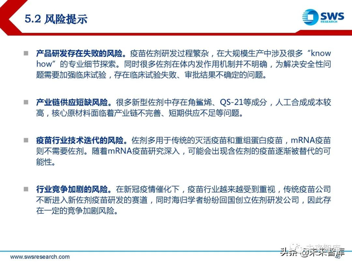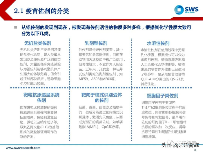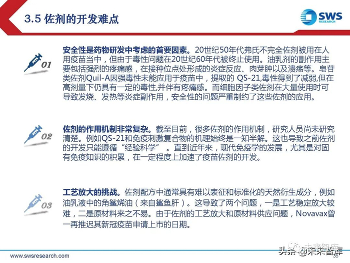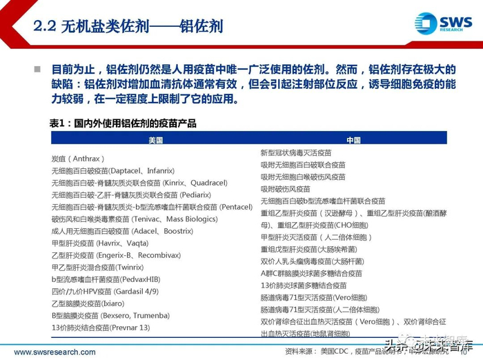 目前为止,铝佐剂仍然是人用疫苗中唯一广泛使用的佐剂。然而,铝佐剂存在极大的 缺陷:铝佐剂对增加血清抗体通常有效,但会引起注射部位反应,诱导细胞免疫的能 力较弱,在一定程度上限制了它的应用。(报告来源:未来智库)