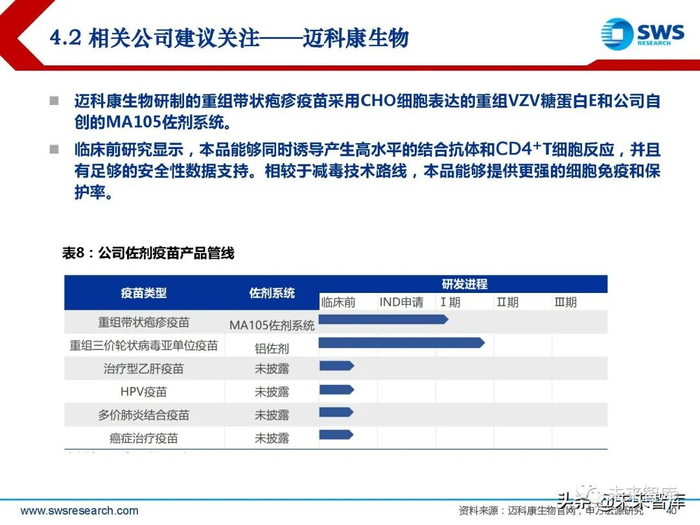 迈科康生物研制的重组带状疱疹疫苗采用CHO细胞表达的重组VZV糖蛋白E和公司自 创的MA105佐剂系统。临床前研究显示,本品能够同时诱导产生高水平的结合抗体和CD4+T细胞反应,并且 有足够的安全性数据支持。相较于减毒技术路线,本品能够提供更强的细胞免疫和保 护率。
